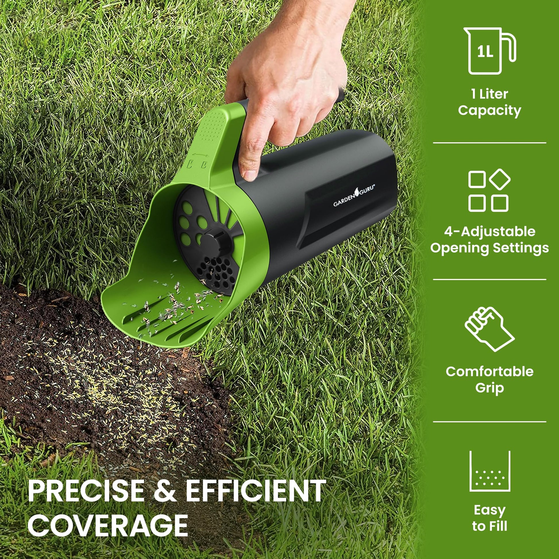 The Garden Guru Handheld Seed Spreader Shaker makes spreading easy and precise. With a lightweight 1L capacity and an adjustable twist cap with multiple opening sizes, it’s perfect for distributing grass seed, fertilizer, salt, ice melt, and more with consistent, controlled coverage.